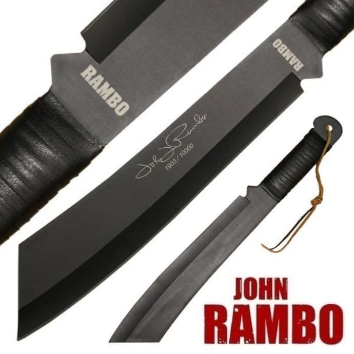 Authentique machette tirée des films Rambo 4 (2008) et Rambo 5 : Last Blood (2019) et utilisée par John Rambo (Sylvester Stallone), le dernier survivant d'un commando d'élite formé durant la guerre du Vietnam. De haute qualité, cette fidèle réplique a été soigneusement conçue à partir de l'arme d'origine utilisée dans les films avec une attention particulière portée aux détails et aux finitions. D'une conception solide, cette lourde machette est fabriquée à la main à partir d'une seule pièce d'acier inoxydable à haute teneur en carbone avec une finition noire mate pour éviter les reflets dans la nuit (6,1 cm à son point le plus large). La lame aiguisée est imprimée sur une face avec le logo "Rambo" à sa base et la signature "John Rambo" (vous pouvez l'affûter davantage avec une pierre à aiguiser). Elle se prolonge pour former la poignée qui est composée de 2 plaques de bois entourées de cuir noir (12 cm de long). La poignée offre une excellente prise en main tandis que le pommeau est doté d'un trou qui laisse passer un cordon en cuir marron pour sécuriser l'arme. Le robuste fourreau en cuir marron gravé avec le logo "Rambo" et la signature "John Rambo" comporte un passant de ceinture et un cordon en cuir marron pour l'attacher à la jambe (48 cm de long et 140 g). Indispensable aux fans du héros, cette reproduction en taille réelle ravira les collectionneurs de machettes de combat équilibrées et fonctionnelles.